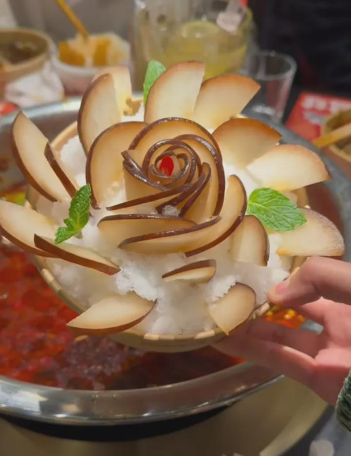 冻梨是雕刻成玫瑰花形状,进行精致摆盘的。