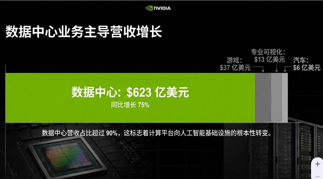 四季度英伟达的数据中心业务录得营收623.14亿美元,同比增长75%,增速高于前一季度同比增长66%,分析师预期同比增近70%至603.6亿美元。