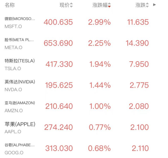 明星科技股普涨,英伟达涨1.44%,微软涨2.99%,Meta涨2.25%,特斯拉涨1.94%,亚马逊涨1%,苹果和谷歌涨约0.7%。