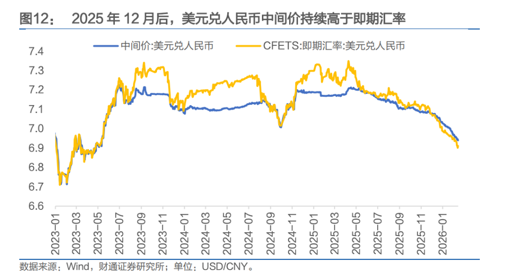 财通证券指出,2025年全年美元指数下跌9.4%,而人民币相对美元仅升值4.3%。若以人民币汇率指数衡量,人民币对一篮子货币实际全年下跌3.4%,意味着人民币整体在贬值,仅是相对美元走强。这一数据清晰表明,本轮升值的核心驱动来自美元端。
