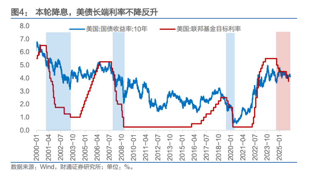 从资产表现看,本轮美联储降息周期内,10年期美债利率不降反升。自2024年9月降息启动以来,由3.73%上行至2026年2月13日的4.04%,累计上行31BP。财通证券指出,这与2001年、2007年、2019年三轮降息周期中长端利率显著下行的规律截然相反,反映市场对美元资产信心渐失,美债需向投资者提供更高信用溢价。