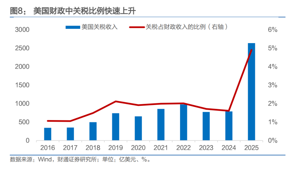 为赢得2026年中期选举,特朗普面临压低物价、降低借贷成本的政治压力。财通证券分析,其可动用的工具主要有两项:一是控制能源价格,但受制于OPEC+及美国本土石油企业利益,效果存疑;二是通过关税豁免减少输入性通胀,但关税已占美国财政收入5.0%,大规模削减将直接冲击财政收入,迫使财政部增发国债,进而继续侵蚀美元主权信用。