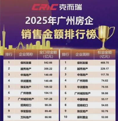 从市场销售端看,越秀似乎也是为了“一雪前耻”。据克而瑞监测披露,2025年广州房企销售榜显示,全口径及权益金额第一均是保利发展,越秀暂时屈居第二,虽跟第三的中海拉开了差距,但作为广州楼市“地头蛇”,被同为总部位于广州的央企保利突然压一头,除了内心不爽,压力还陡增。
