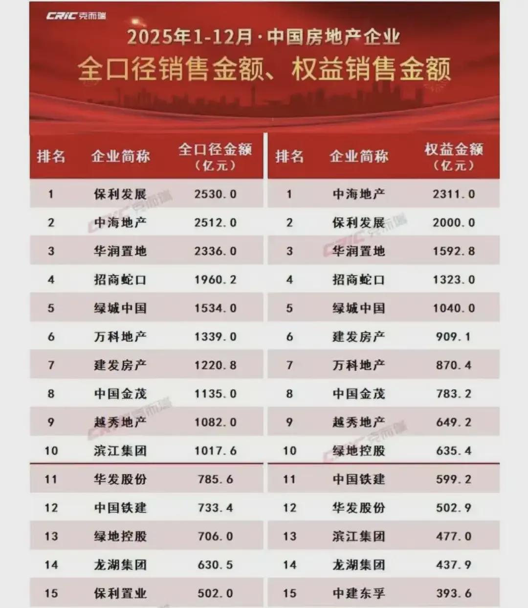 参考克而瑞数据,2025年全年,按全口径销售额看,千亿房企一共10家,分别是保利(2530亿元)、中海(2512亿元)、华润(2326亿元)、招商蛇口(1960亿元)、绿城(1534亿元)、万科(1339亿元)、建发(1220.8亿元)、金茂(1135亿元)、越秀(1082亿元)与滨江(1017.6亿元)。