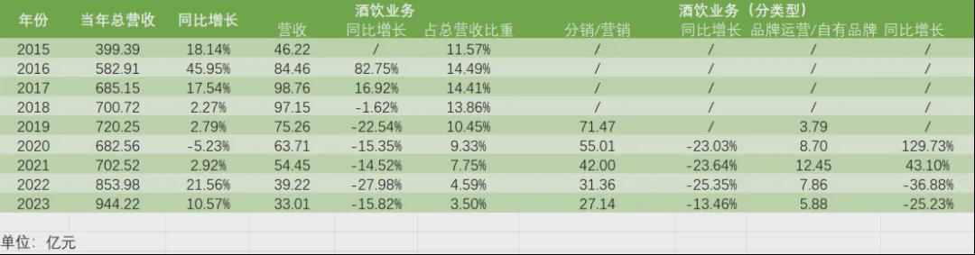 其中,酒饮品牌运营/自有品牌业务营收分别为8.7亿元、12.45亿元、7.86亿元和5.88亿元,从2021年开始呈现明显下滑趋势。