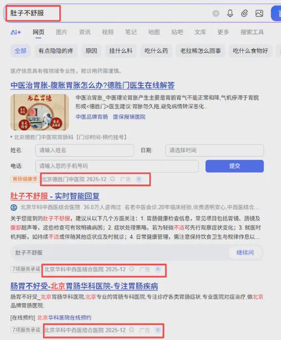 有媒体这样说道,当我在百度网页上搜“肚子不舒服”,前三条全是广告——第一条让填北京德胜门中医院胃肠科的预约信息,第二条、第三条都是北京华科中西医结合医院的广告。