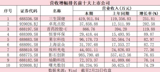 从增幅榜单来看,三生国健、卓兆点胶、首药控股分列营收增幅前三位,2025年分别实现营业收入41.99亿元、3.79亿元、866.76万元,同比分别增长251.81%、202.58%、119.88%。