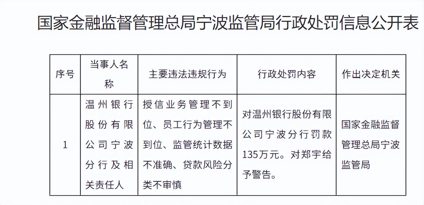 先是1月30日,国家金融监督管理总局宁波监管局披露,温州银行宁波分行因“授信业务管理不到位、员工行为管理不到位、监管统计数据不准确、贷款风险分类不审慎”四项违规,被处以135万元罚款,相关责任人郑宇被给予警告。