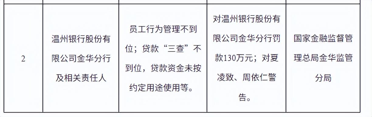 仅仅十天后,2月9日,国家金融监督管理总局金华监管分局再开罚单。温州银行金华分行因“员工行为管理不到位、贷款‘三查’不到位、贷款资金未按约定用途使用”等问题,被罚款130万元,两名责任人夏凌致、周依仁被警告。