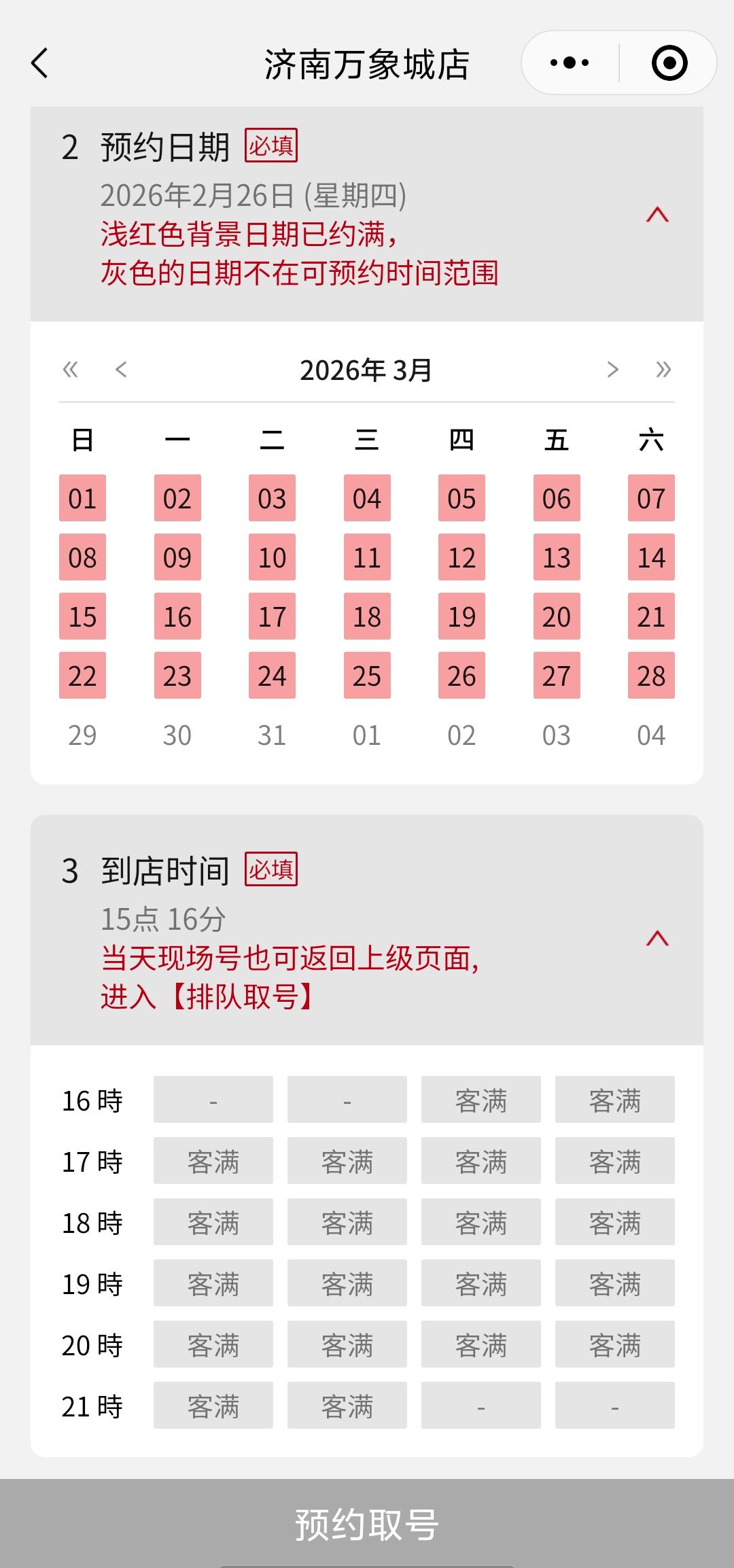 2月26日,红星资本局通过寿司郎小程序查询发现,寿司郎(济南万象城店)从2月26日至3月28日的预约均已约满,目前3月29日不在可预约时间范围内。