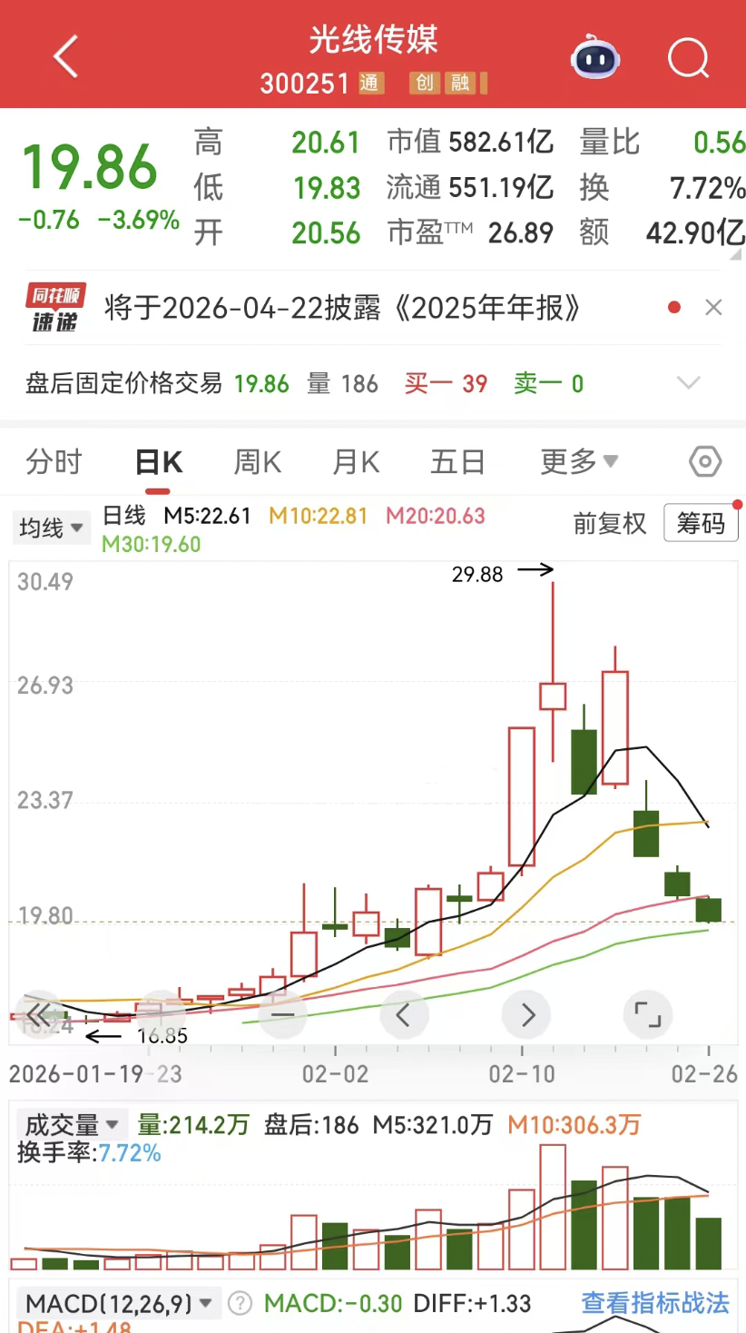 此次股价暴跌的直接导火索,是光线传媒押注的春节档核心影片《飞驰人生3》表现未达市场预期。作为2026年春节档票房冠军,《飞驰人生3》截至2月23日累计票房达29.26亿元,看似成绩亮眼。不过,最终票房可能低于节前机构预测的40亿元-50亿元目标,也未能复刻2025年《哪吒之魔童闹海》的爆款效应。