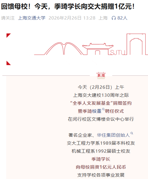 此外,据上海交通大学微信公众号消息,华住集团创始人、交大工程力学系1989届本科校友、机械工程系1992届硕士校友季琦,也向母校捐资1亿元人民币,支持上海交通大学各项事业发展。