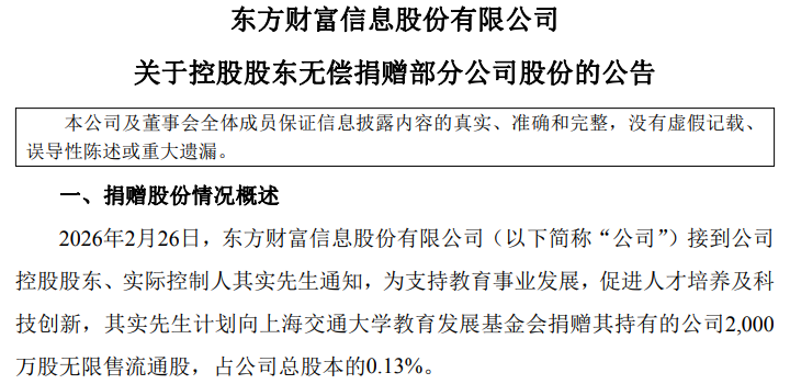 2月26日晚,东方财富公告称,接到公司控股股东、实际控制人其实通知,为支持教育事业发展,促进人才培养及科技创新,其实计划向上海交通大学教育发展基金会捐赠其持有的公司2000万股无限售流通股,占公司总股本的0.13%。