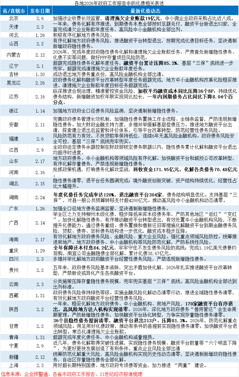比如,2月24日湖南省政府网发布的《2026年湖南省政府工作报告》指出,去年年度化债任务完成率达120%,退出融资平台304家,债务结构明显优化。