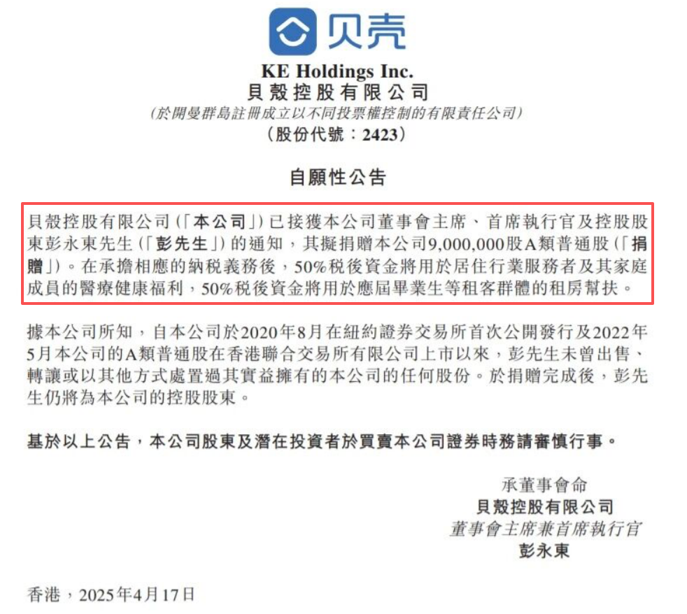 贝壳联合创始人彭永东与单一刚宣布,将共同捐赠1000万股A类普通股,设立“健康家贝守护金”,覆盖50万人及其背后数十万个家庭。