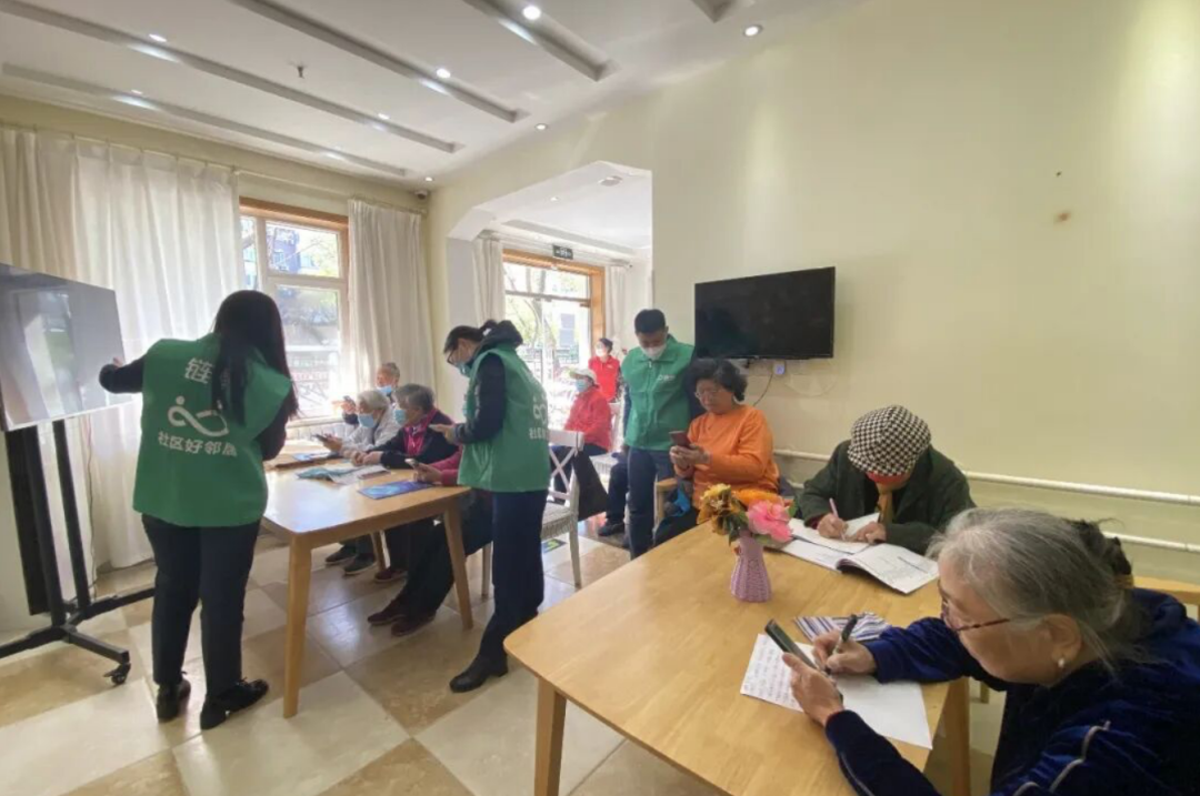 北京新外大街6号院旁的链家门店里,67岁的张阿姨跟几个老伙伴围坐在一起,学习如何使用智能手机的课程(来源:北京西城)