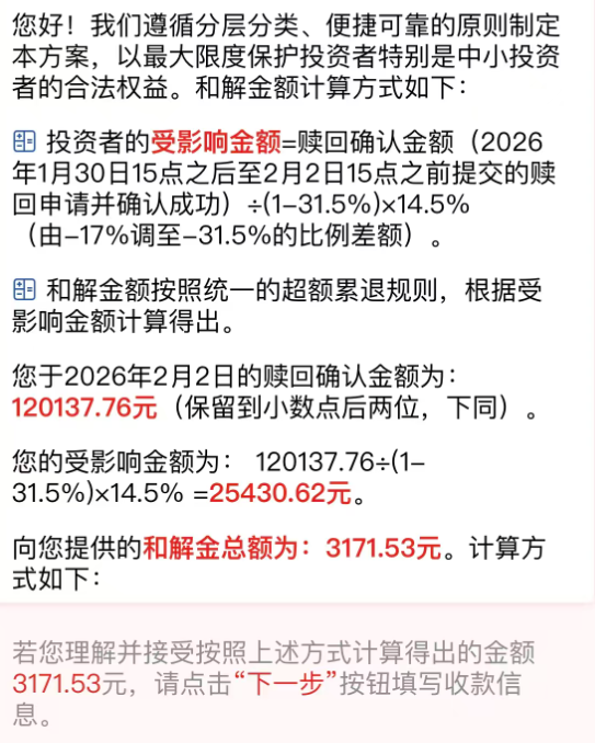 举个例子,有位投资者赎回确认金额是24544.57元,算下来“多亏”的部分是5195.57元,最后拿到的赔偿是1919.56元。
