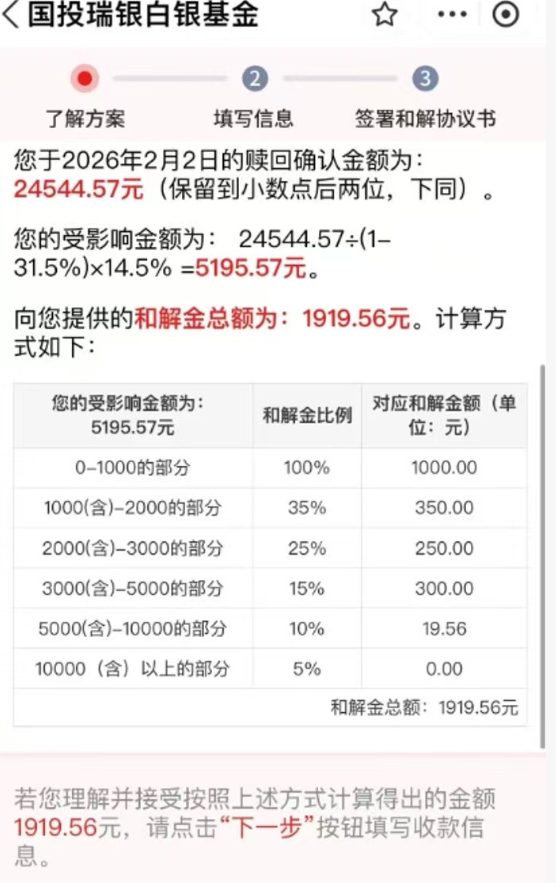 同时,买了国投白银LOF基金A份额和C份额投资者更是不满。因为亏损被合并计算,导致总额一下子冲进了赔偿比例极低的高档位,感觉亏大了。