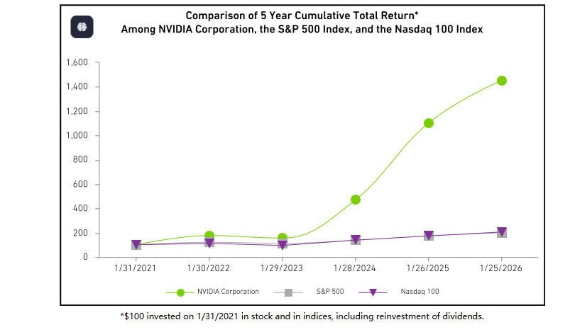 但不可否认的是,投资英伟达是一笔不错的买卖。如果你在2021年末向英伟达投资100美元,截至2026年1月25日,这笔资产已膨胀至1448.75美元。在约四年里,英伟达跑赢了大盘。
