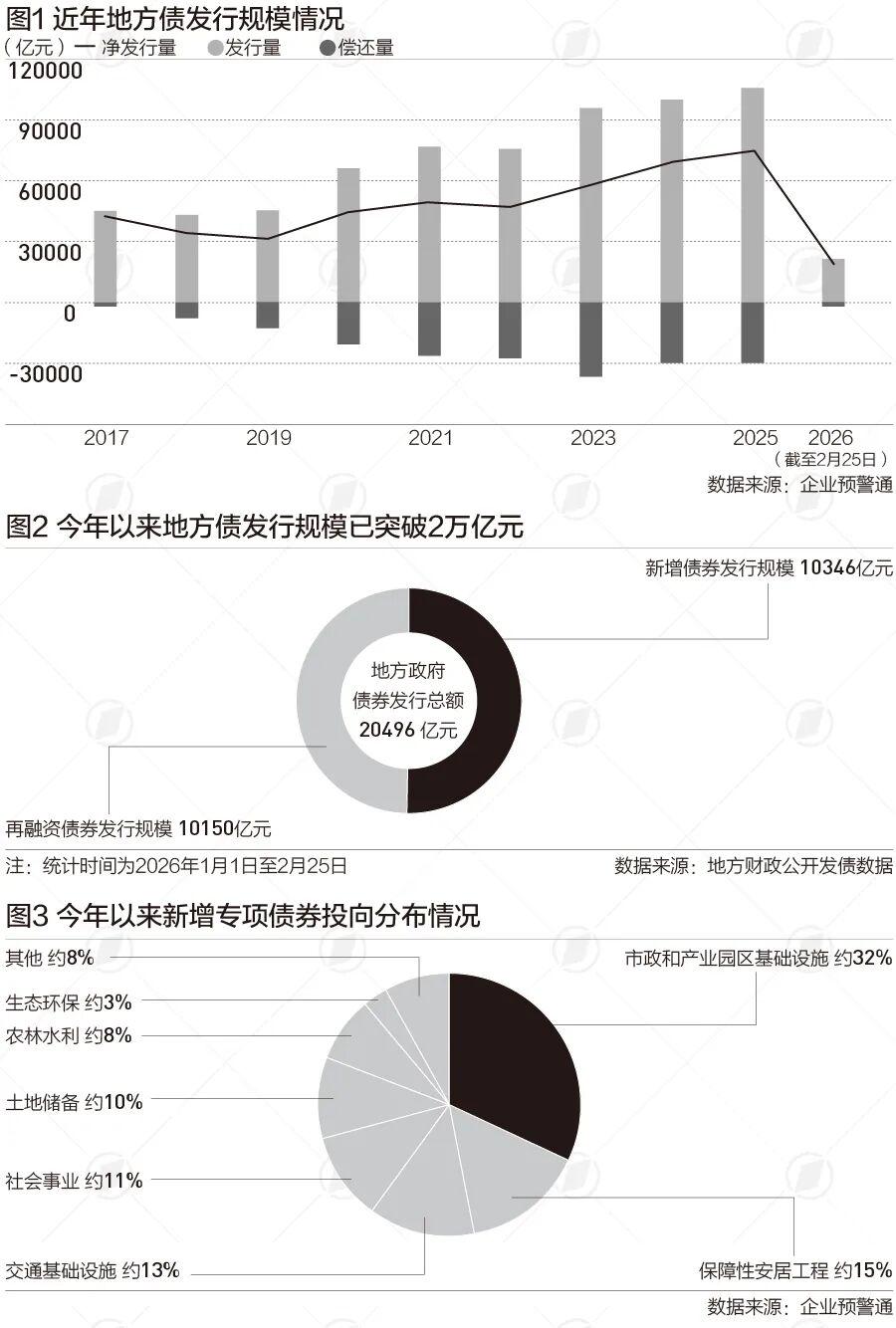 根据公开发债数据,截至2月25日,在地方政府发行的约2万亿元政府债券中,新增债券和再融资债券大概各占一半。