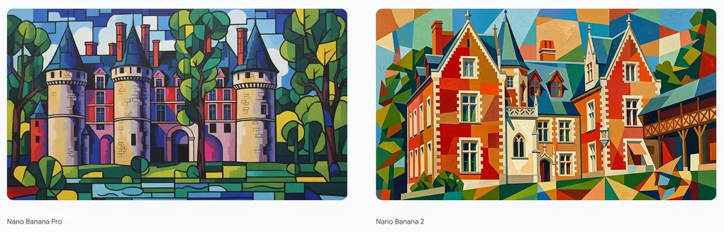 这张则是让模型先搜索克洛·吕斯城堡(达·芬奇晚年居住的法国城堡)的真实照片作为参考,然后用色彩明艳的综合立体主义风格重新演绎。