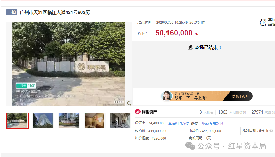 该房产由湛江市坡头区人民法院春节前挂拍。根据法院公告,该房产坐落于广州市天河区临江大道421号902房,是第一次拍卖,权属人为许火健。