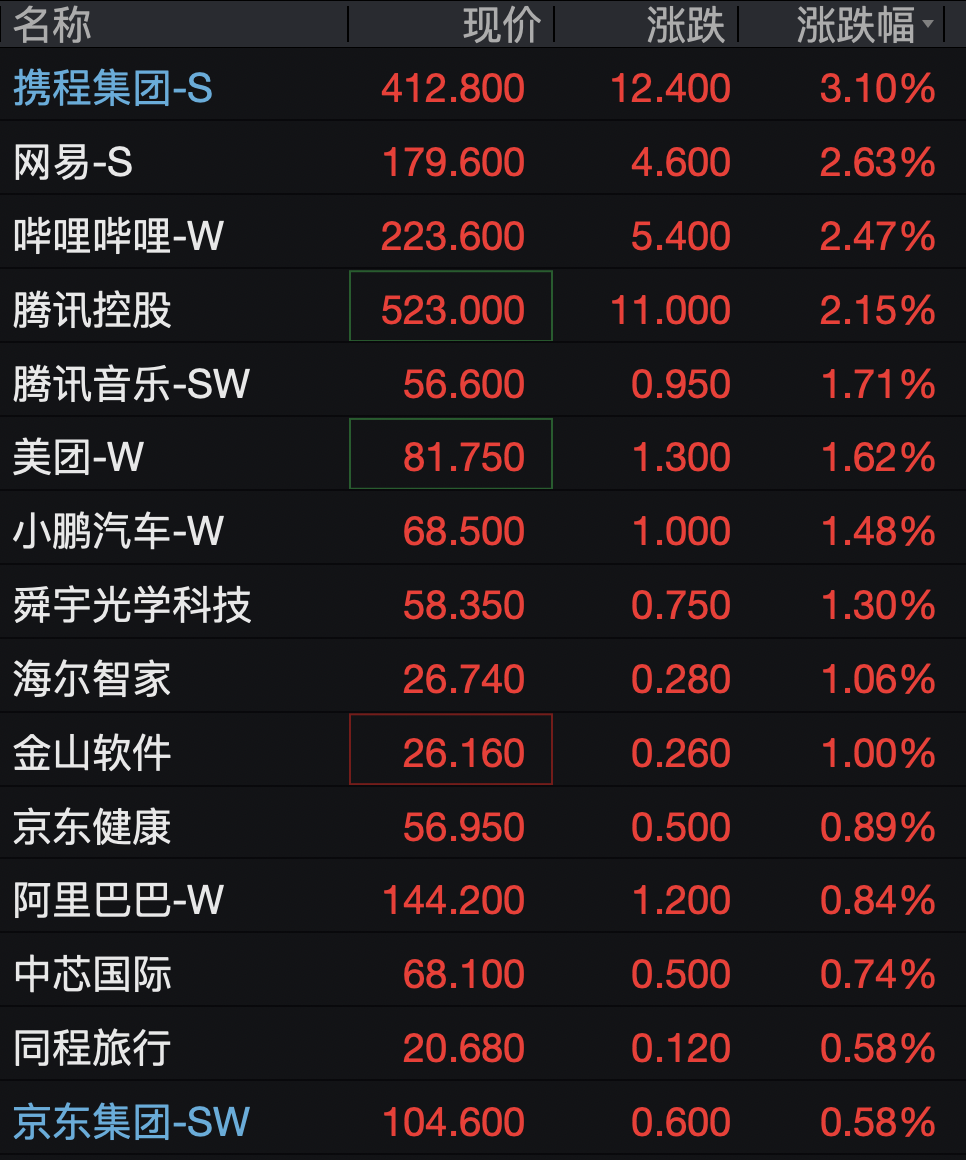 2月27日,港股震荡走高,大型科网股普涨,携程集团涨超3%,网易、哔哩哔哩、腾讯控股涨超2%,美团、金山软件、阿里巴巴、中芯国际、京东等均上涨。