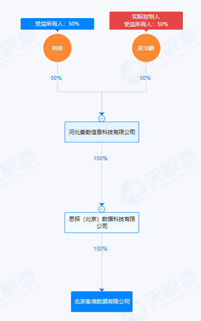 但截至记者发稿时,包括天眼查、企查查等在内的多个平台均显示,东数三号旗下控制的企业只有86家,显然与93家不相符。经过仔细对比,记者发现,北京秦淮、深圳秦淮等几家主要企业仍然没有被东数三号控股。同时,平台信息显示,在对北京秦淮经过股权穿透后,其股东分别是吴华鹏(持股50%)和肖蒨(持股50%)。