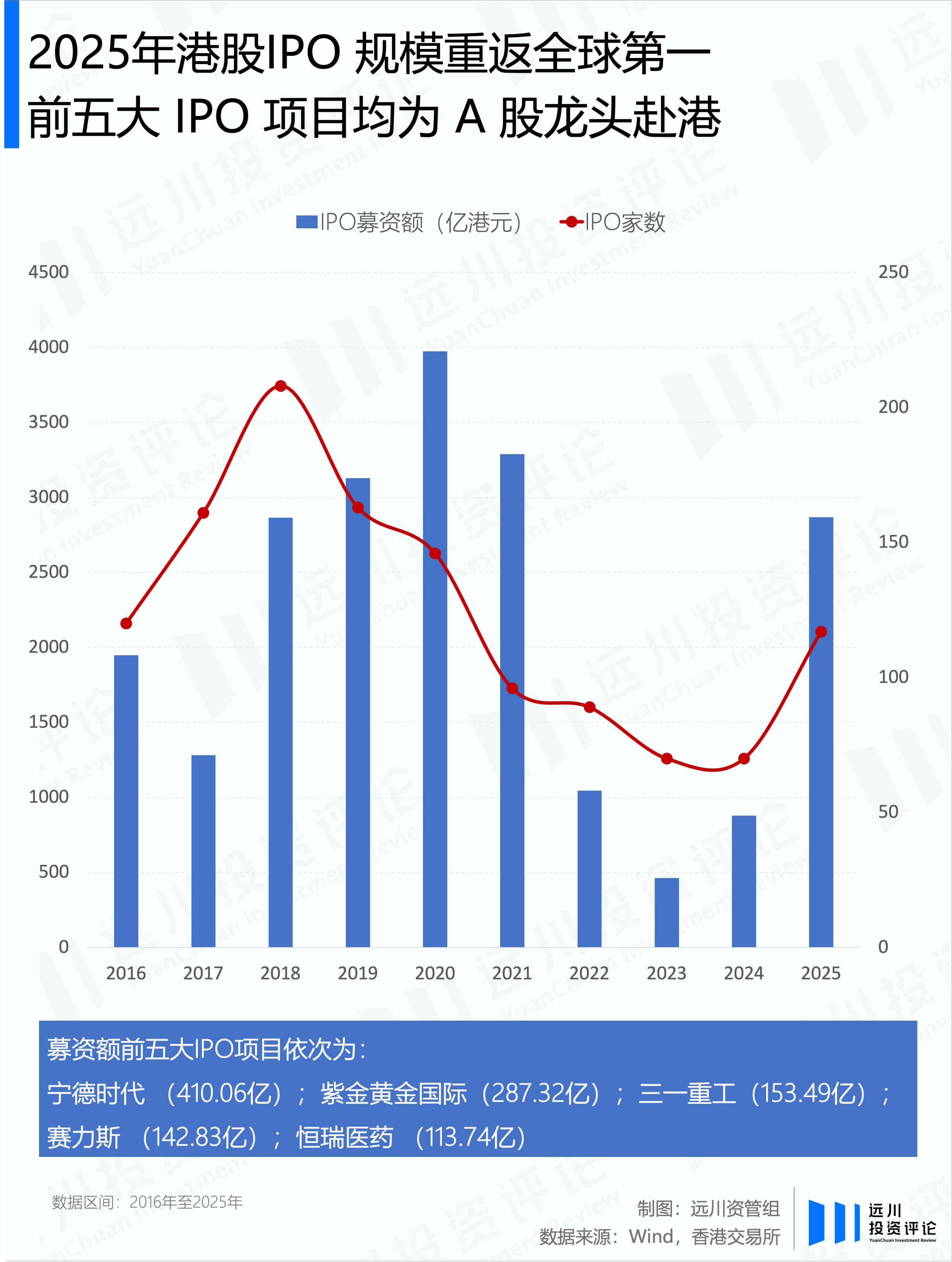 但与以往的高光期不同的是,2025 年的 IPO 项目“含 A 率”极高,前五大 IPO 项目均有 A 股的身影——宁德时代、紫金黄金国际、三一重工、赛力斯和恒瑞医药,而这五家的融资总额占全年港交所融资总额的比重超过 38%。