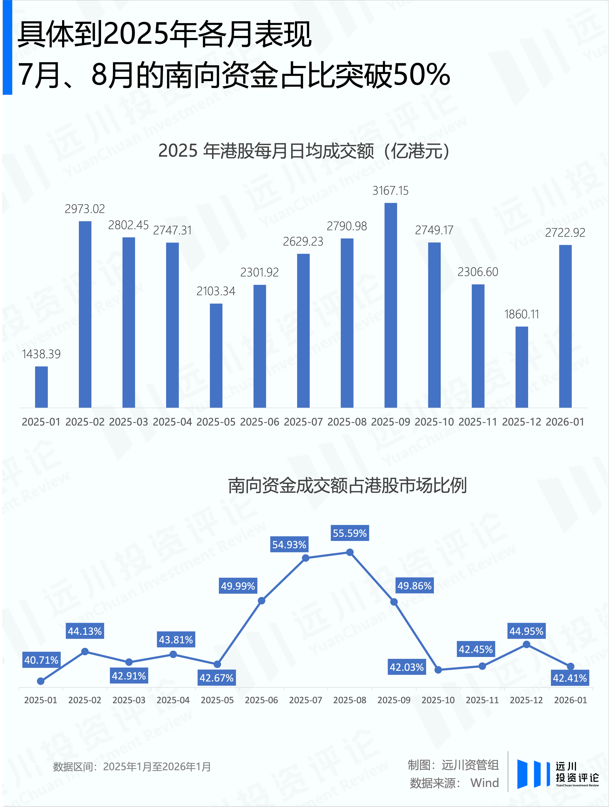 从交易占比来看,2025 年也是南下资金占比最高的一年。尤其是在 4 月关税风暴之后,南下资金在港股交易额中的占比一度有过显著提升,7 月和 8 月一度占据日均交易额的半壁江山。不过该项数据从9月之后又有所回落,在时间线上,和恒科的调整有一定的正相关。