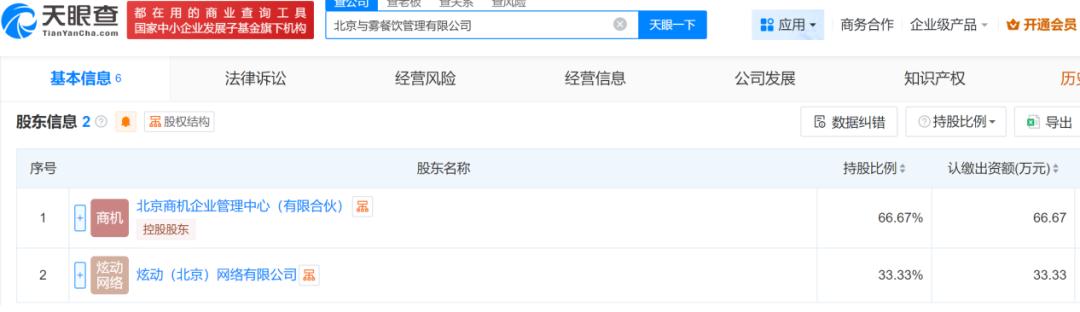 天眼查APP显示,今年2月9日成立的北京与雾餐饮管理有限公司,股权穿透后最终受益人为王思聪。这家注册资本为100万元的餐饮类公司,经营范围包括餐饮管理、外卖递送服务以及商业综合体管理服务等。目前该公司有两大股东,穿透股权来看,王思聪持股33.33%的北京商机企业管理中心(有限合伙)是与雾餐饮公司的大股东,持股比例为66.67%。