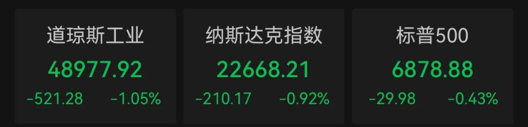 截至收盘,道琼斯工业指数下跌521.28点,跌幅1.05%,收于48977.92点;标普500指数下跌29.98点,跌幅0.43%,收于6878.88点;纳斯达克指数下跌210.17点,跌幅0.92%,收于22668.21点。