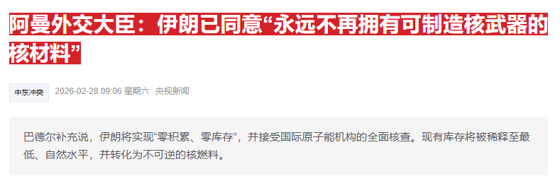 最新的消息是,阿曼外交大臣巴德尔2月27日在美国华盛顿接受采访时称,伊朗已同意不拥有“可制造核弹的核材料”。
