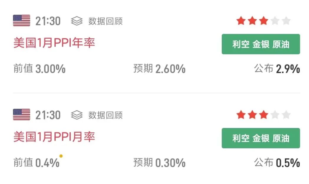 另外,昨晚美股避险情绪大幅升温,昨晚美国公布的1月PPI同比增长2.9%,大超市场预期,按理说应该会压制降息预期,但美债收益率却大跌破4%,同时黄金、原油大幅走强,COMEX黄金期货涨1.64%,COMEX白银期货涨7.67%,WTI期货4月合约收涨2.78%。