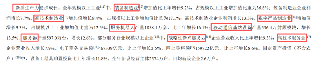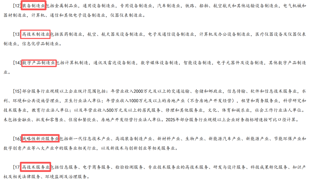 装备制造业、高技术制造业、数字产品制造业、服务机器人、移动通信基站设备、服务器、战略新兴服务业、高技术服务业。