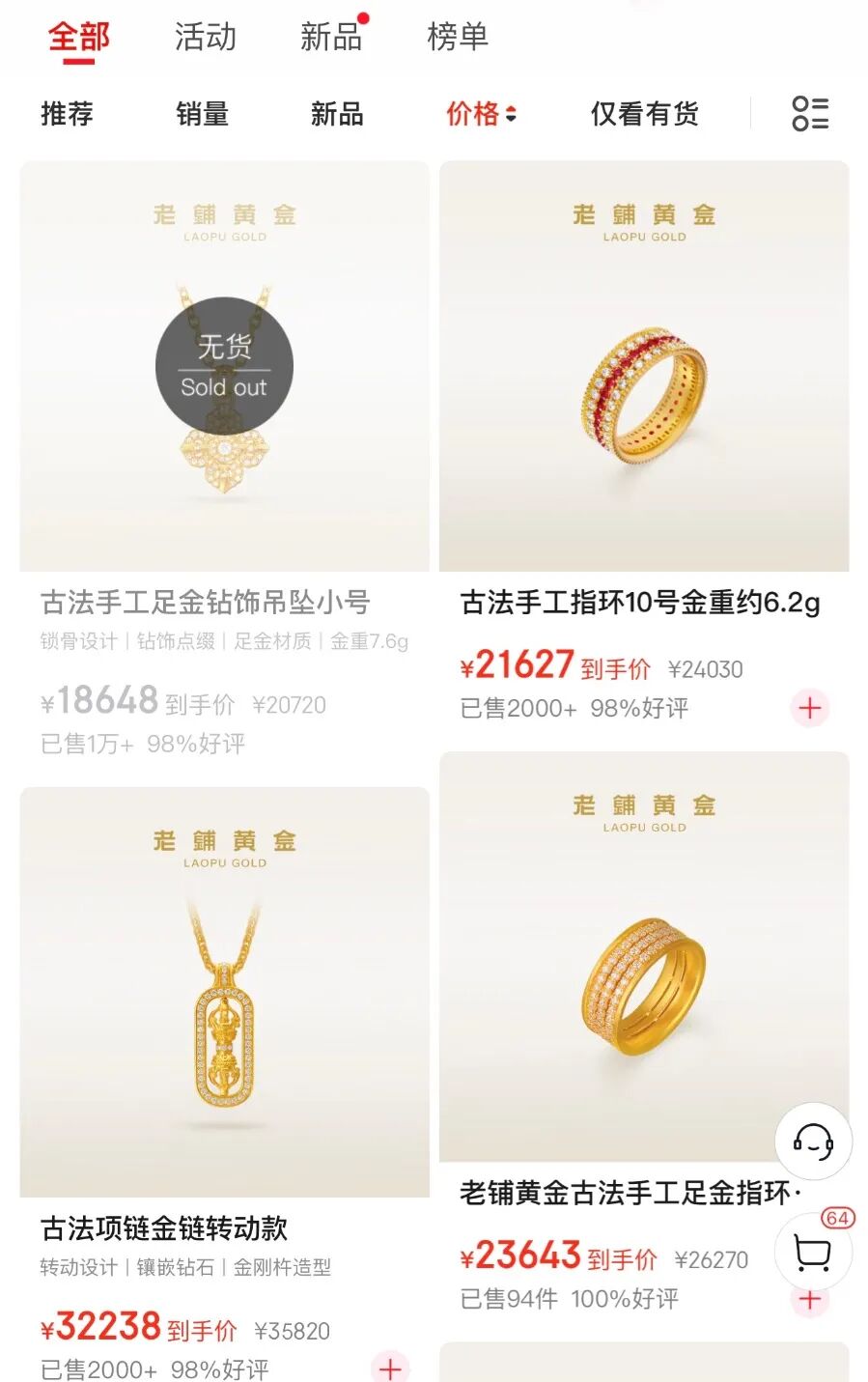 在涨价之后,依据老铺黄金官网价格,价格最低的是一款7.6克的古法手工足金钻饰吊坠(小号),价格为18648元(显示已售罄);价格最高的则是91845元的足金吊坠金链款佛祖吊坠,克重约37.8克。计算下来,每克单价(含工艺费)逼近2500元。