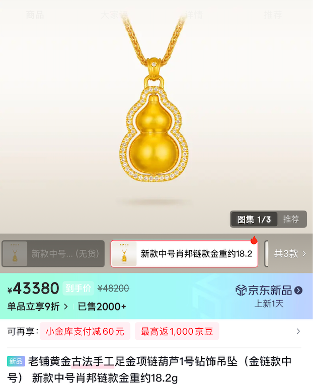 而目前,同等克重的葫芦吊坠已涨至43380元,差价近万元,产品上涨幅度达29%。