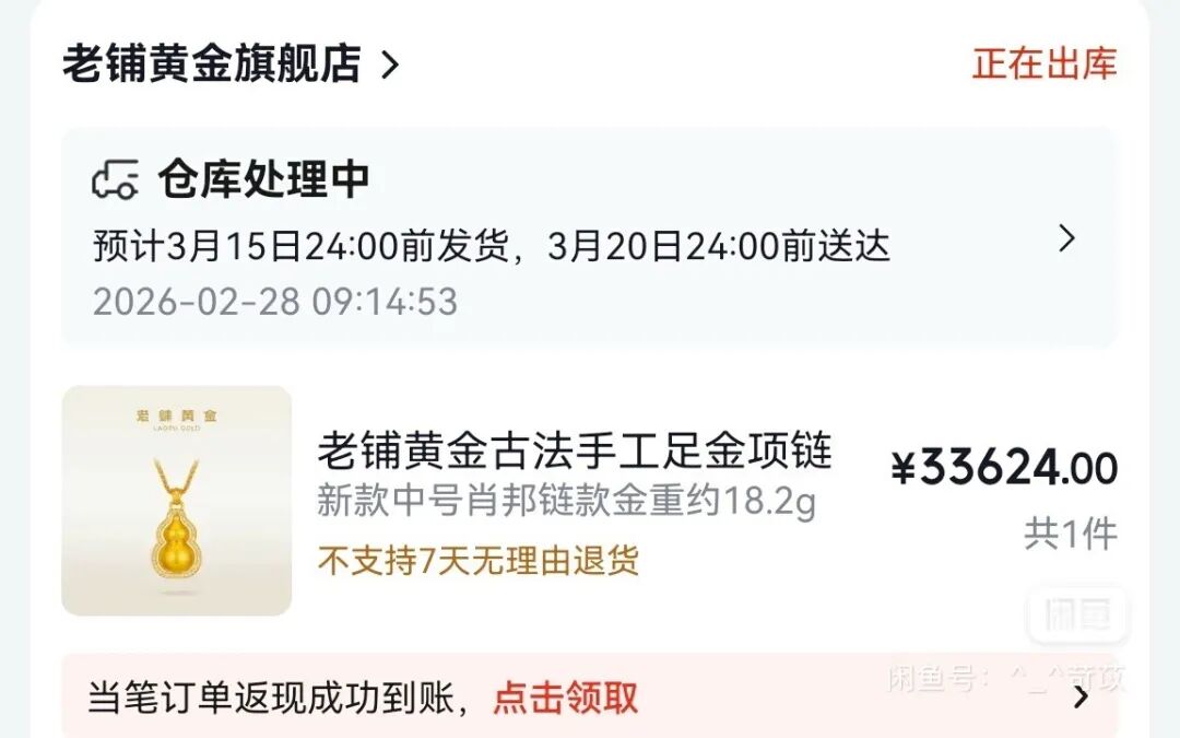 在一张网友发布的转卖老铺黄金截图中可以看到,卖家以33624元购入一条18.2克的项链,显示3月15日前发货。在沟通中,卖家表示该产品加价200元可以出。
