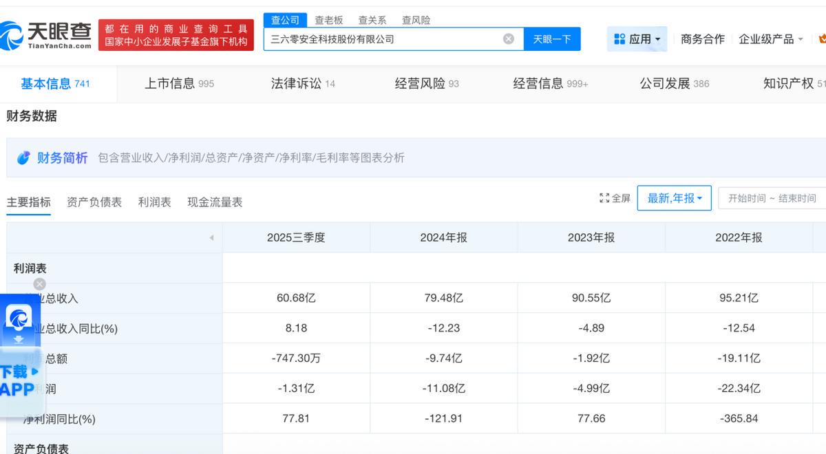 天眼查APP显示:去年前三季度,360的营收增速恢复至同比增长8.18%,但归属净利润依然未能扭亏为盈……