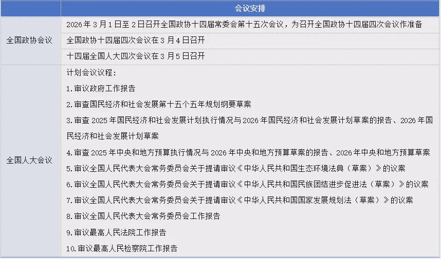 按照惯例,在3月5日全国人大开幕会议上,政府工作报告有望提出2026年工作目标,包括GDP增速、通胀、赤字率目标、货币政策与财政政策安排等。