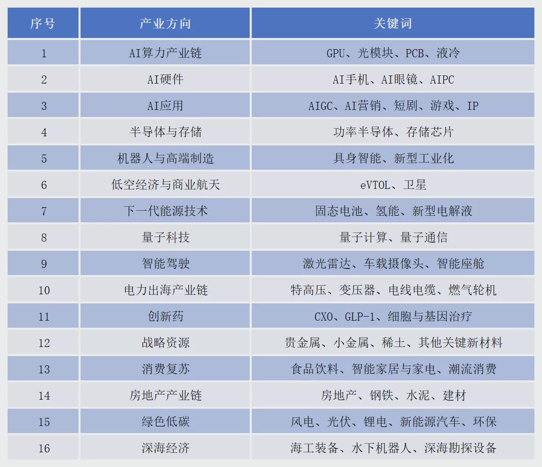 东方财富则梳理出了AI算力产业链、半导体与存储、低空经济与商业航天、量子科技、创新药、绿色低碳、智能驾驶等16个“2026年两会投资者最看好的投资方向”。