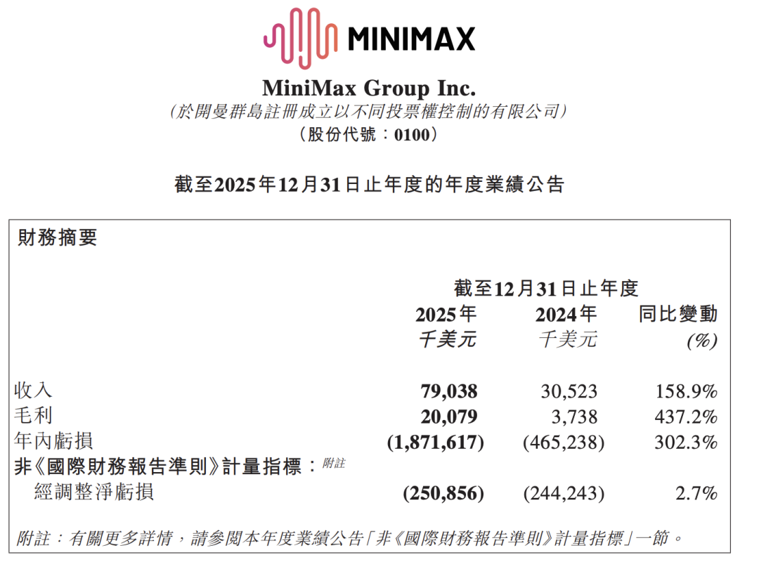 财报显示,2025年MiniMax营收约7904万美元,同比增长159%;年内亏损同比增加302%至18.7亿美元,其中金融负债公允价值亏损近16亿美元,经调整净亏损为2.5亿美元。