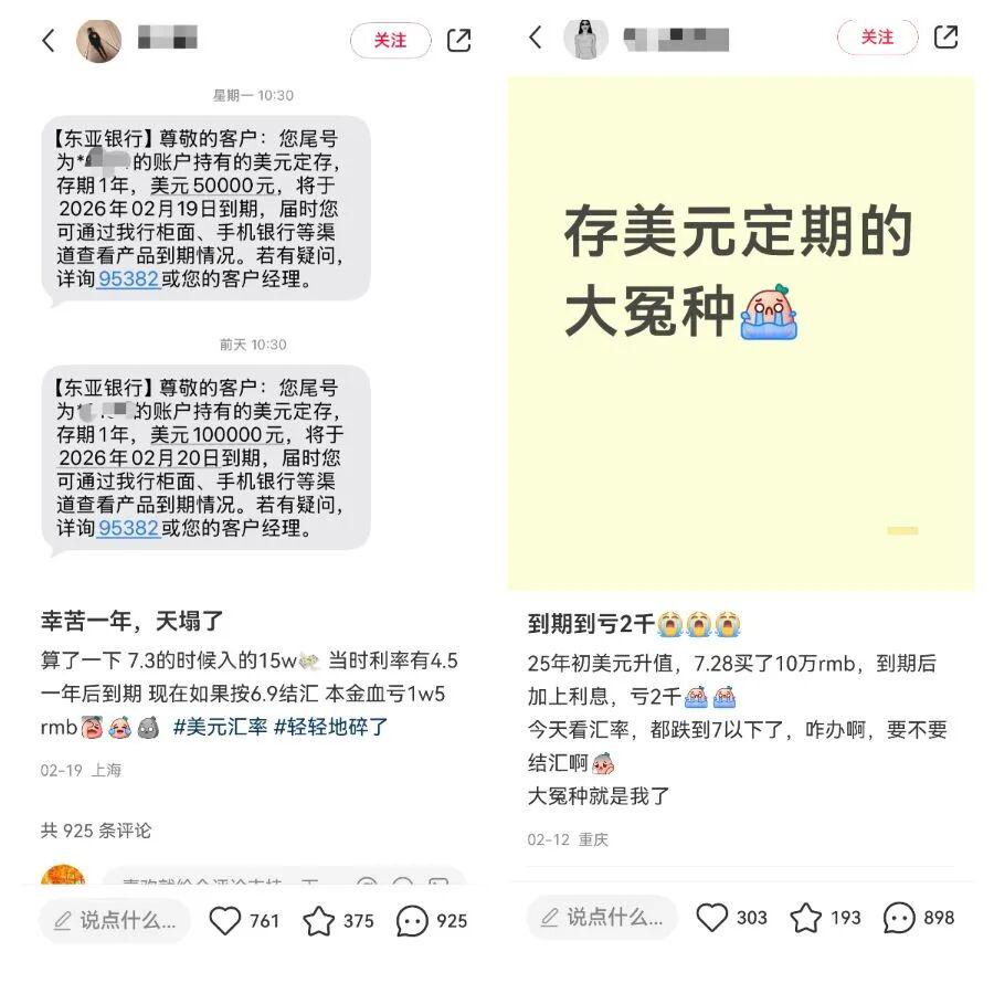 社交平台上,不少投资者发帖称去年高位购汇存美元定期存款或买美元理财产品,在美元兑人民币汇率接连跌破7、6.9关口后已经出现亏损。
