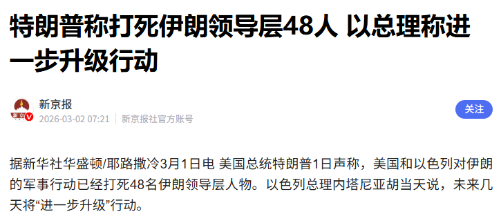 按照特朗普的说法,已经有48名伊朗高层被精准点杀,除了哈梅内伊本人之外,伊斯兰革命卫队总司令,伊朗国防部长,武装部队总参谋长,国防委员会秘书等高级指挥官,也全都被刺杀了。