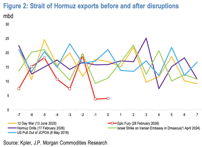 据追风交易台,3月1日摩根大通发布原油闪评报告《对尚未发生的风险进行定价》,报告指出,霍尔木兹海峡油轮交通放缓至接近静止,这一进展迫使市场重新评估地缘风险与全球能源贸易韧性