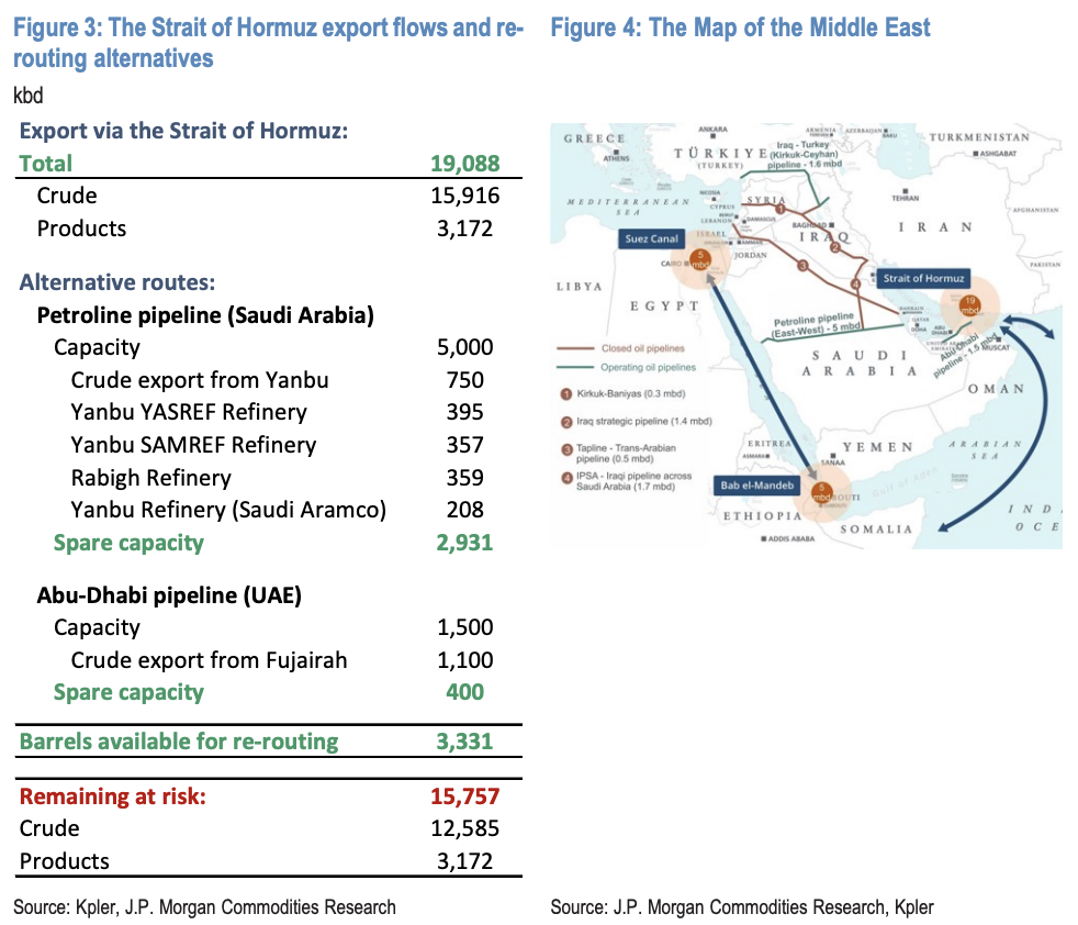 沙特阿拉伯(Petroline管道,产能500万桶/日)和阿联酋(Abu Dhabi管道,产能150万桶/日)现有绕行管道合计仅能疏导约3.3百万桶/日,其余约15.8百万桶/日的原油出口无替代疏散渠道。