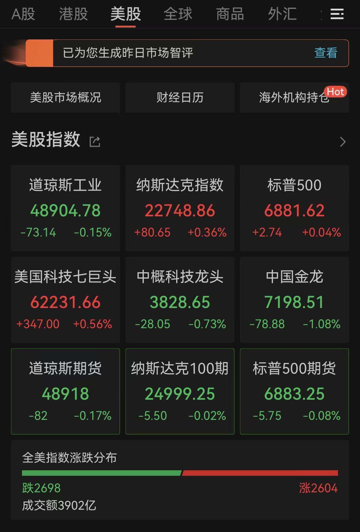 纳斯达克中国金龙指数跌1.08%,盛大科技跌超14%,逸仙电商、亿咖通科技跌超8%,震坤行跌超6%,金山云、再鼎医药跌超4%。云米科技涨超10%,博美涨超8%,奇富科技涨超5%,小牛电动涨超3%,贝壳、晶科能源涨超2%。