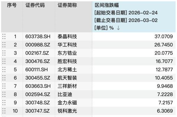 区间数据显示,泰晶科技(603738.SH)以37.07%的涨幅领跑整个板块,成为市场关注的焦点。紧随其后的是华工科技(000988.SZ),涨幅达到26.74%。此外,东方锆业(002167.SZ)、胜宏科技(300476.SZ)和北方稀土(600111.SH)也表现不俗,涨幅分别为20.08%、16.71%和12.79%。
