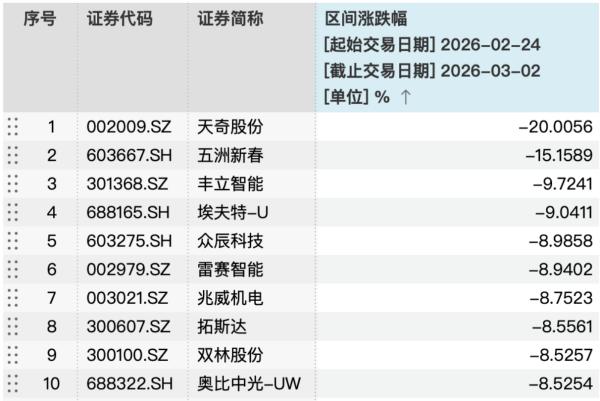 从个股公司情况看,Wind数据显示,在2026年2月24日至3月2日的交易中,人形机器人概念板块表现呈现显著分化,纳入统计的个股中,部分个股表现强势,而另一些则出现较大幅度回调。