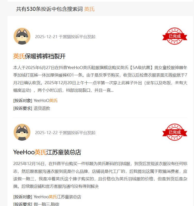 黑猫投诉网查阅消费者投诉,关键词英氏共有530条投诉,包括了质量和服务。搜索舒比奇词条有53条投诉,近期有消费者投诉舒比奇旗舰店出售有问题的纸尿裤,导致孩子出现疹子;之前没问题,存在ab货混发;搜索忆小口有13条相关投诉。